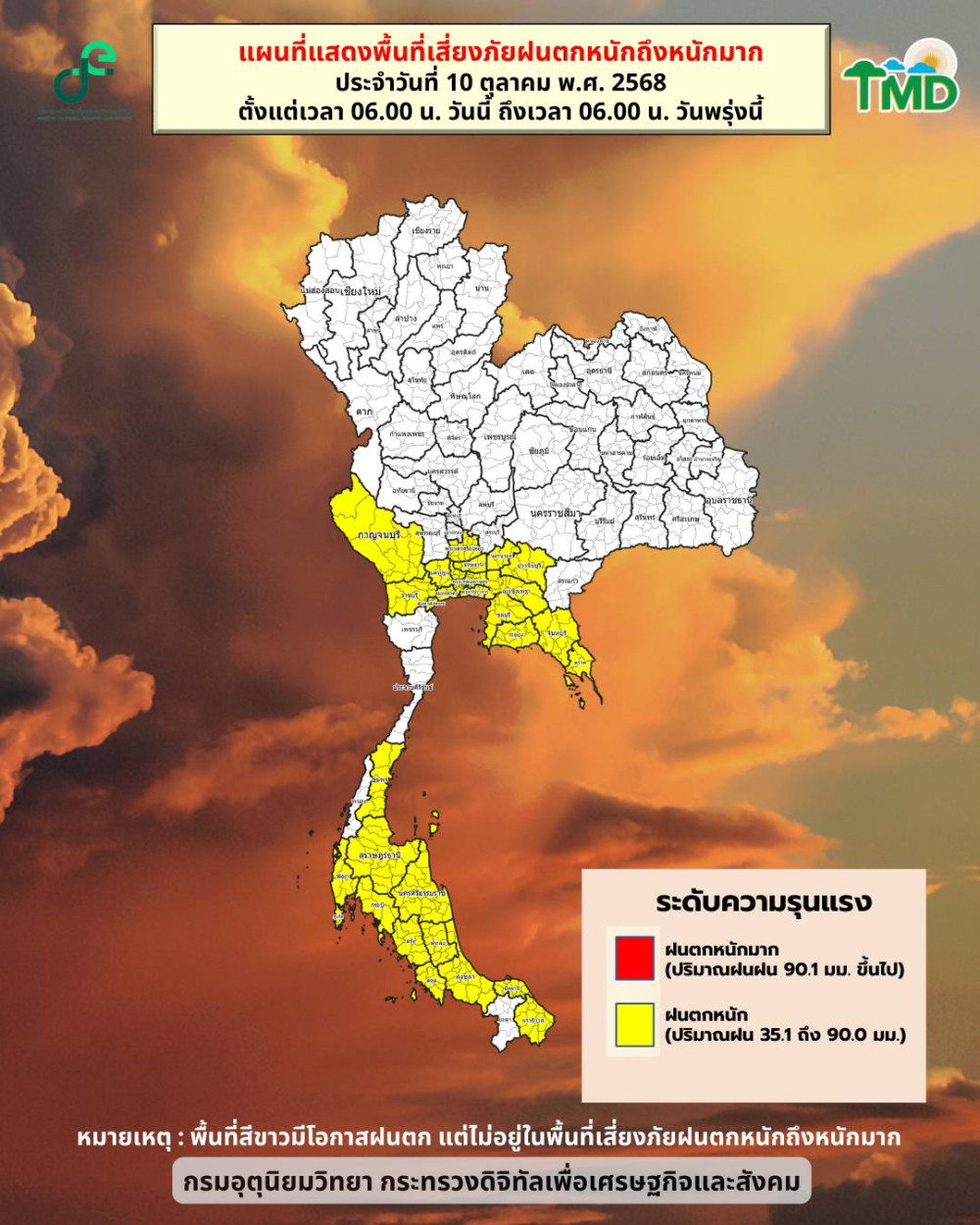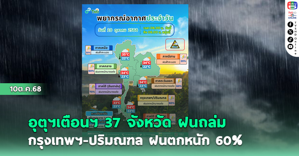 10 ตุลาคม 2568 กรมอุตุนิยมวิทยาพยากรณ์อากาศ 24 ชั่วโมงข้างหน้า ภาคกลาง รวมทั้งกรุงเทพมหานครและปริมณฑล ภาคตะวันออก และภาคใต้มีฝนตกหนักบางแห่ง ทั้งนี้เนื่องจากร่องมรสุมเลื่อนลงมาพาดผ่านภาคกลางตอนล่าง ภาคใต้ตอนบน และภาคตะวันออก ประกอบกับมรสุมตะวันตกเฉียงใต้พัดปกคลุมทะเลอันดามัน ภาคใต้ และอ่าวไทย ขอให้ประชาชนในบริเวณดังกล่าวระวังอันตรายจากฝนตกหนักไว้ด้วย ส่วนภาคเหนือและภาคตะวันออกเฉียงเหนือมีฝนลดลงกว่าเมื่อวานนี้