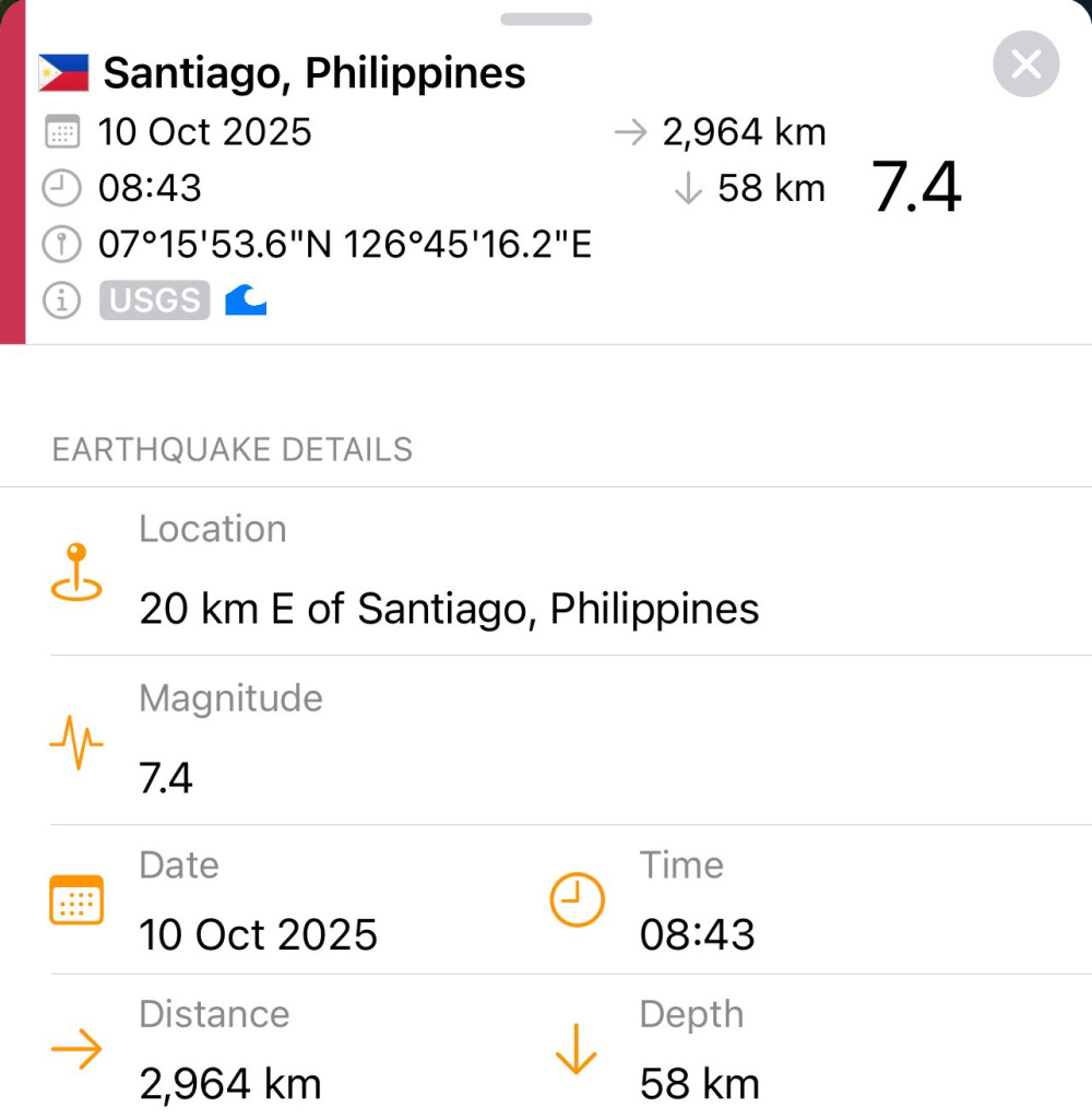 วันที่ 10 ตุลาคม 2568 มีรายงานจากหน่วยงานธรณีวิทยาฟิลิปปินส์ว่า เกิดแผ่นดินไหวขนาด 7.4 แมกนิจูด บริเวณนอกชายฝั่งด้านตะวันออกของเกาะ มินดาเนา ซึ่งเป็นเกาะใหญ่ทางตอนใต้ของประเทศฟิลิปปินส์