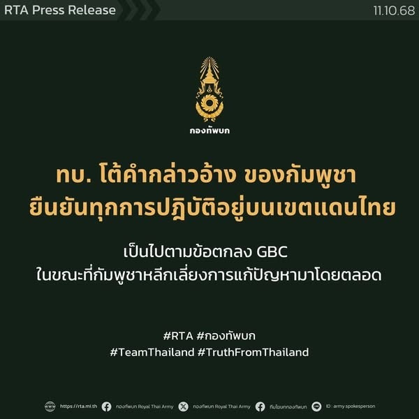 กองทัพบกชี้แจงกรณีคําแถลงของกัมพูชากล่าวหาไทยบุกรุกพื้นที่ ยืนยันทุกการปฏิบัติอยู่ในเขตแดนไทย และเป็นไปตามข้อตกลง GBC