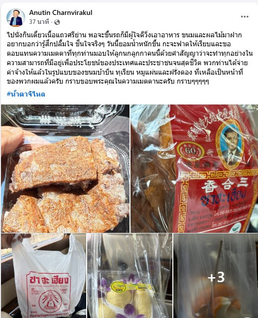นายกรัฐมนตรีอนุทิน ซาบซึ้งน้ําใจประชาชน หลังได้รับอาหารและขนมขณะไปกินก๋วยเตี๋ยวศรีย่าน โพสต์ขอบคุณผ่านเฟซบุ๊ก พร้อมสัญญาจะทําทุกอย่างเพื่อประโยชน์ของประเทศและประชาชนจนสุดชีวิต