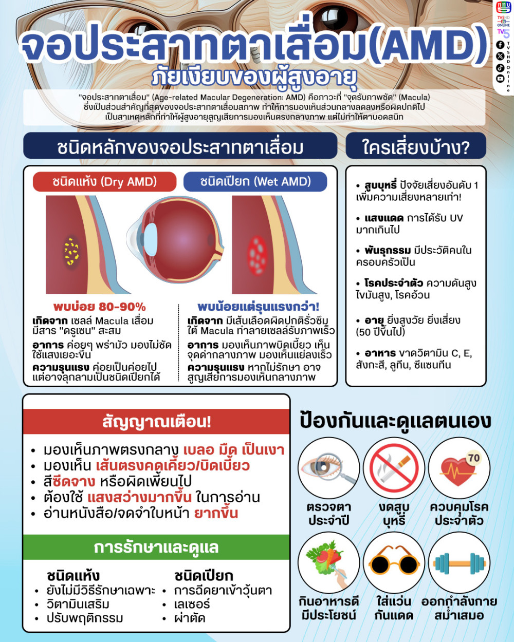 "จอประสาทตาเสื่อม" (Age-related Macular Degeneration: AMD) คือภาวะที่ "จุดรับภาพชัด" (Macula) ซึ่งเป็นส่วนสําคัญที่สุดของจอประสาทตาเสื่อมสภาพ ทําให้การมองเห็นส่วนกลางลดลงหรือผิดปกติไป เป็นสาเหตุหลักที่ทําให้ผู้สูงอายุสูญเสียการมองเห็นตรงกลางภาพ แต่ไม่ทําให้ตาบอดสนิท!