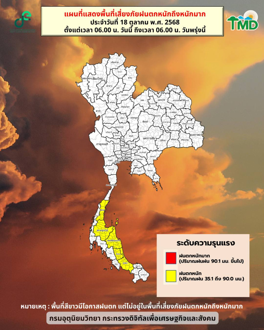 วันที่ 18 ตุลาคม 2568 - กรมอุตุนิยมวิทยา รายงานพยากรณ์อากาศ 24 ชั่วโมงข้างหน้า ประเทศไทยตอนบนยังคงมี ฝนฟ้าคะนองเกิดขึ้นได้บางพื้นที่ ส่วนภาคใต้มีฝนฟ้าคะนองหลายแห่ง และบางพื้นที่มี ฝนตกหนัก จากอิทธิพลของลมตะวันออกและลมตะวันออกเฉียงใต้ที่พัดปกคลุมอ่าวไทย ประเทศไทย และทะเลอันดามัน ขอให้ประชาชนในภาคใต้โดยเฉพาะพื้นที่เสี่ยงภัย เฝ้าระวัง ฝนตกหนัก–ฝนสะสม ที่อาจทําให้เกิดน้ําท่วมฉับพลัน และเพิ่มความระมัดระวังในการเดินทางผ่านเส้นทางที่มีน้ําท่วมขัง ส่วนบริเวณ ทะเลอันดามันและอ่าวไทย มีคลื่นสูงประมาณ 1 เมตร และบริเวณที่มีฝนฟ้าคะนองคลื่นสูงกว่า 2 เมตร ชาวเรือควรเดินเรือด้วยความระมัดระวัง และหลีกเลี่ยงการออกเรือในพื้นที่ที่มีฝนฟ้าคะนอง