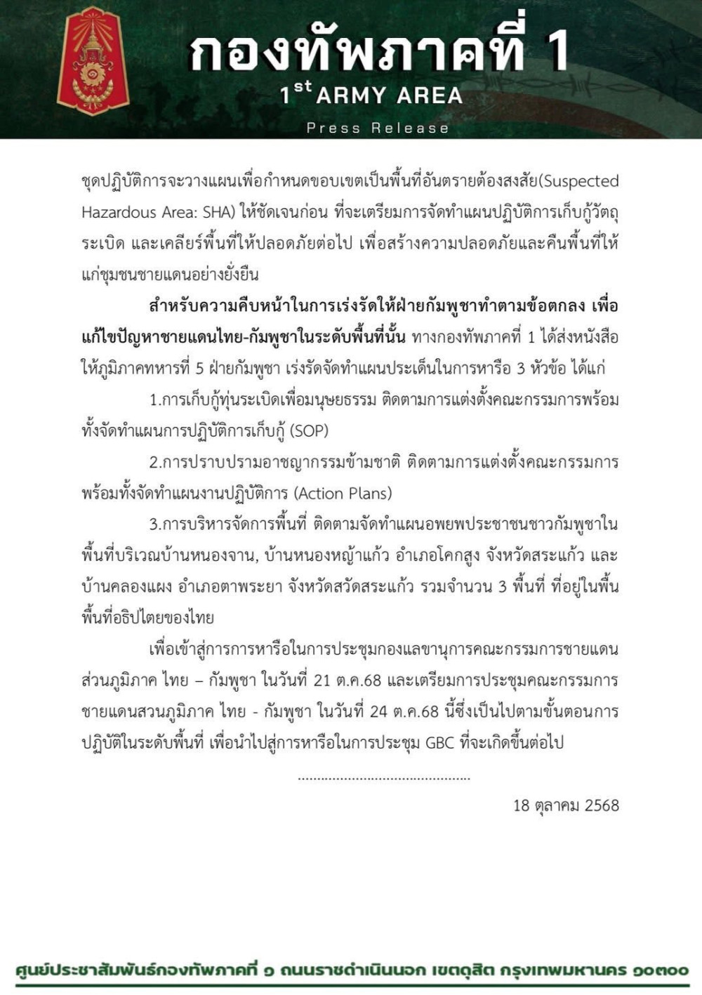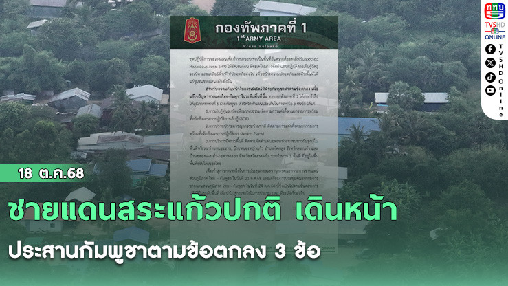 กองทัพภาคที่ 1 รายงานสถานการณ์ชายแดนไทย–กัมพูชา จ.สระแก้วปกติ ย้ําความร่วมมือ 3 ประเด็นหลัก ก่อนการประชุมระดับภูมิภาค 21–24 ต.ค.นี้