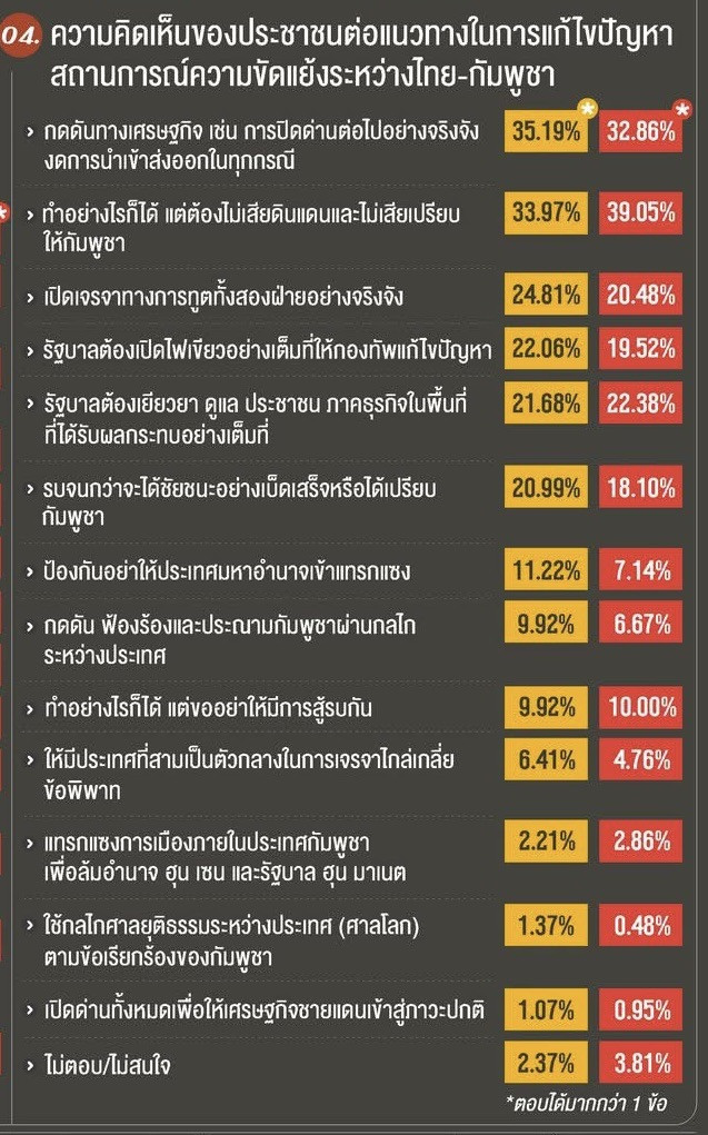แนวทางแก้ไขปัญหาที่ต้องการ เมื่อถามถึงแนวทางในการแก้ไขปัญหาความขัดแย้งไทย-กัมพูชา ประชาชนส่วนใหญ่เลือก "กดดันทางเศรษฐกิจ เช่น การปิดด่านต่อไปอย่างจริงจัง" (ร้อยละ 35.19) รองลงมาคือ "ทําอย่างไรก็ได้ แต่ต้องไม่เสียดินแดนและไม่เสียเปรียบให้กัมพูชา" (ร้อยละ 33.97) และ "รัฐบาลต้องเปิดไฟเขียวอย่างเต็มที่ให้กองทัพแก้ไขปัญหา" (ร้อยละ 22.06)