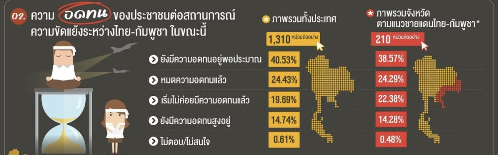 วันที่ 19 ตุลาคม 2568 - ศูนย์สํารวจความคิดเห็น “นิด้าโพล” สถาบันบัณฑิตพัฒนบริหารศาสตร์ (นิด้า) ได้เปิดเผยผลสํารวจเรื่อง “คนไทย ยังอดทนอยู่หรือเปล่า?” ซึ่งทําการสํารวจระหว่างวันที่ 14-16 ตุลาคม 2568 จากประชาชน 1,310 หน่วยตัวอย่างทั่วประเทศ เกี่ยวกับความพอใจและความกังวลต่อสถานการณ์ความขัดแย้งไทย-กัมพูชา