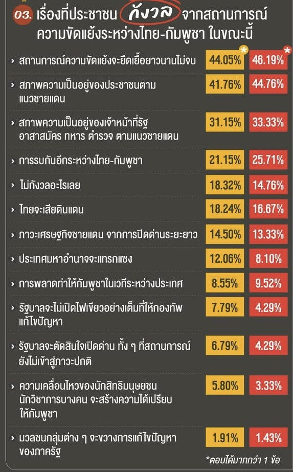 ความกังวลหลักของประชาชน ประชาชนมีความกังวลมากที่สุดคือ สถานการณ์ความขัดแย้งจะยืดเยื้อยาวนานไม่จบ (ร้อยละ 44.05) และกังวลเกี่ยวกับ สภาพความเป็นอยู่ของประชาชนตามแนวชายแดน (ร้อยละ 41.76) รวมถึง สภาพความเป็นอยู่เจ้าหน้าที่รัฐ อาสาสมัคร ทหาร ตํารวจ ตามแนวชายแดน (ร้อยละ 31.15)