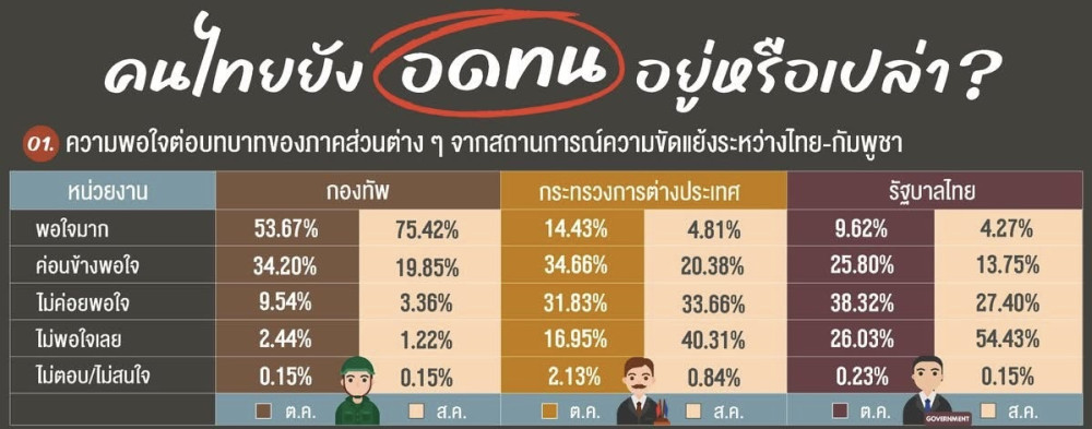 ความพอใจต่อภาคส่วนต่างๆ ผลสํารวจแสดงให้เห็นว่าประชาชนมีความพอใจต่อบทบาทของ กองทัพ สูงที่สุด โดยมีผู้ระบุว่า "พอใจมาก" ถึงร้อยละ 53.67 และ "ค่อนข้างพอใจ" ร้อยละ 34.20 ขณะที่ความพอใจต่อ กระทรวงการต่างประเทศ อยู่ในระดับกลาง โดยผู้ที่ "ค่อนข้างพอใจ" มีร้อยละ 34.66 ส่วนความพอใจต่อ รัฐบาลไทย อยู่ในระดับต่ําสุด โดยมีผู้ที่ "ไม่ค่อยพอใจ" ถึงร้อยละ 38.32 และ "ไม่พอใจเลย" ร้อยละ 26.03