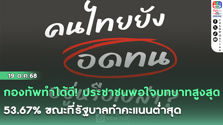 นิด้าโพลเปิดผลสํารวจ "คนไทยยังอดทนอยู่หรือเปล่า"! ประชาชนพอใจบทบาทกองทัพสูงสุด 53.67% ขณะที่ความพอใจต่อรัฐบาลต่ําสุด หวั่นสถานการณ์ยืดเยื้อไม่จบ