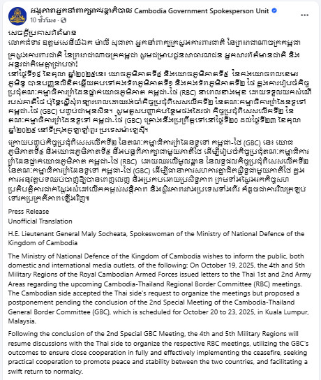 ทั้งนี้ ฝ่ายกัมพูชาได้ตอบรับคําเชิญจากฝ่ายไทยในการจัดการประชุมดังกล่าว แต่ได้เสนอให้ เลื่อนกําหนดการออกไปก่อน เพื่อรอให้การประชุม คณะกรรมการชายแดนทั่วไป (General Border Committee – GBC) วาระพิเศษครั้งที่ 2 ซึ่งจะจัดขึ้นระหว่างวันที่ 20–23 ตุลาคม 2568 ณ กรุงกัวลาลัมเปอร์ ประเทศมาเลเซีย เสร็จสิ้นลงก่อน