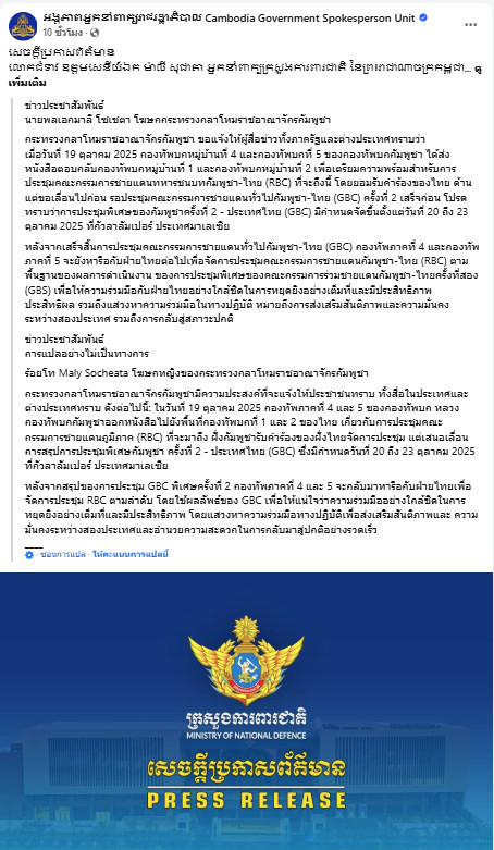 วันที่ 20 ตุลาคม 2568 - ในช่วงกลางดึกที่ผ่านมา กระทรวงกลาโหมแห่งราชอาณาจักรกัมพูชา ได้ออกแถลงการณ์ผ่านเพจ Government Spokesperson Unit โดยระบุว่า กองทัพภูมิภาคที่ 4 และ 5 ของกัมพูชา ได้ส่งหนังสือถึงกองทัพภาคที่ 1 และ 2 ของกองทัพบกไทย เพื่อหารือเกี่ยวกับการจัดประชุม คณะกรรมการชายแดนส่วนภูมิภาค (Regional Border Committee – RBC) ระหว่างสองประเทศ