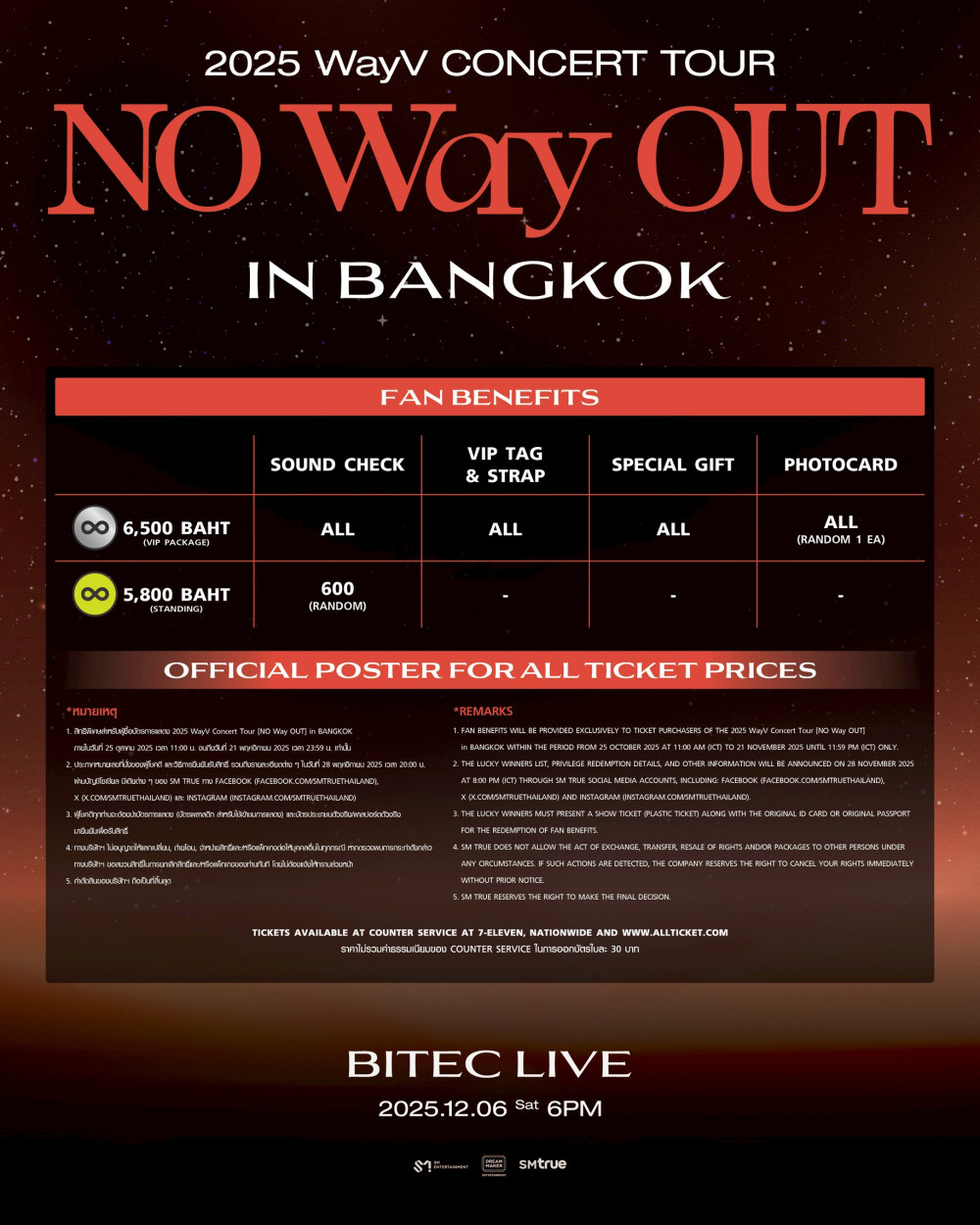 จําหน่ายทางเคาน์เตอร์เซอร์วิสในร้าน 7-Eleven ทุกสาขาทั่วประเทศ และทางเว็บไซต์ www.allticket.com/event/WayV_NOWayOUT_BANGKOK