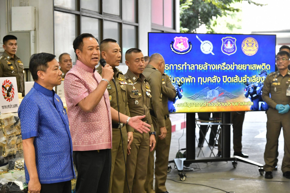 วานนี้ 21ตุลาคม 2568 เวลา 16.00 น. ที่กองบัญชาการตํารวจปราบปรามยาเสพติด (บช.ปส.) นายอนุทิน ชาญวีรกูล นายกรัฐมนตรีและรัฐมนตรีว่าการกระทรวงมหาดไทยแถลงผลปฏิบัติ “ยุทธการทําลายล้างเครือข่ายยาเสพติด ทําลายจุดพัก ทุบคลัง ปิดเส้นลําเลียง” สํานักงานตํารวจแห่งชาติ โดยมี นายอรรษิษฐ์ สัมพันธรัตน์ ปลัดกระทรวงมหาดไทย พล.ต.อ.กิตติ์รัฐ พันธุ์เพ็ชร์ ผู้บัญชาการตํารวจแห่งชาติ พล.ต.ท.อาชยน ไกรทอง ผู้บัญชาการตํารวจปราบปรามยาเสพติด (ผบช.ปส.) พ.ต.ต.สุริยา สิงหกมล เลขาธิการสํานักงานคณะกรรมการป้องกันและปราบปรามยาเสพติด (ป.ป.ส.) และผู้บริหารหน่วยงานที่เกี่ยวข้องร่วมงาน