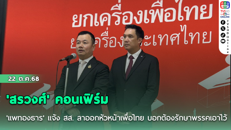 22 ต.ค.2568 ที่ทําการพรรคเพื่อไทย นายสรวงศ์ เทียนทอง เลขาธิการพรรคเพื่อไทย แถลงภายหลังการประชุม สส. พรรคเพื่อไทย ว่า น.ส.แพทองธาร ชินวัตร หัวหน้าพรรคเพื่อไทย ได้เรียกประชุม สส. พรรคเพื่อไทย โดยบอกกล่าวความในใจและเหตุผลที่ลาออกจากหัวหน้าพรรคเพื่อไทย ทุกอย่างต้องมีการเปลี่ยนแปลง พวกเราเองก็ขยับและเตรียมพร้อมสู้ศึกเลือกตั้งที่จะเกิดขึ้นในอนาคต