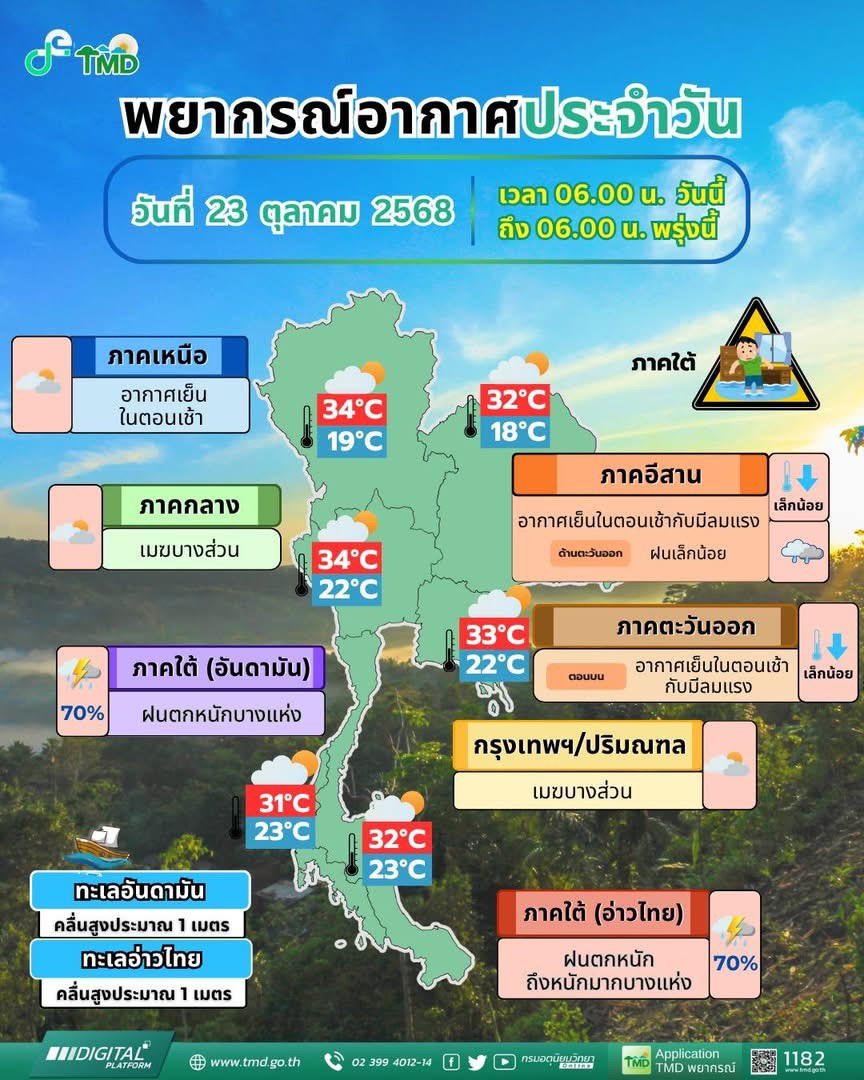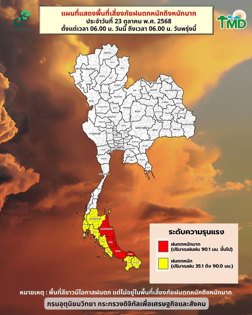 สภาพอากาศวันนี้ (23 ต.ค. 68) ภาคใต้ยังคงมีฝนตกหนักถึงหนักมากบางพื้นที่ จากอิทธิพลของร่องมรสุมที่พาดผ่านภาคใต้ตอนกลาง และมรสุมตะวันออกเฉียงเหนือที่พัดปกคลุมอ่าวไทยและภาคใต้