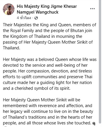 ประชาชนชาวภูฏานขอร่วมไว้อาลัยกับประชาชนชาวไทยต่อการสูญเสียครั้งใหญ่นี้และแสดงความเคารพต่อคุณูปการที่พระองค์ทรงริเริ่มไว้