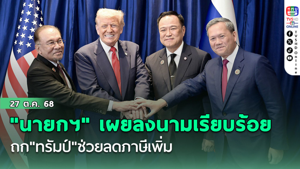 "นายกฯ"เผยลงนามเรียบร้อย คุย"ฮุนมาเนต" ยืนยัน"ไทย-กัมพูชา"ปฏิบัติตามข้อตกลง เชื่อจะลดระดับความขัดแย้ง ถก"ทรัมป์"ช่วยลดภาษีเพิ่ม "ก.พาณิชย์-หน่วยงานเกี่ยวข้อง"หารือ"USTR"ต่อ