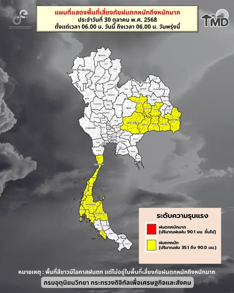 อุตุฯ ประกาศเตือน! สภาพอากาศแปรปรวน ระหว่างวันที่ 30 ต.ค. - 2 พ.ย.2568 มีฝนเพิ่มขึ้น และมีฝนตกหนักบางแห่งในภาคอีสานตอนล่างและภาคใต้ ขอให้ประชาชนระวังอันตรายจากฝนที่ตกหนักซึ่งอาจทําให้เกิดน้ําท่วมได้ในบางพื้นที่