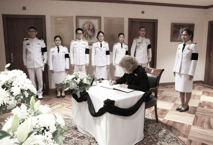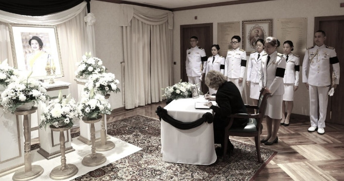 สมเด็จพระราชินีโซเฟีย พระบรมราชชนนีทรงเสด็จยืนสงบนิ่งไว้อาลัยหน้าพระบรมฉายาลักษณ์สมเด็จพระนางเจ้าสิริกิติ์ พระบรมราชินีนาถ พระบรมราชชนนีพันปีหลวง และลงพระนามในสมุดถวายความอาลัย ทรงมีพระราชปฏิสันถารกับอุปทูตและข้าราชการเกี่ยวกับความสูญเสียอันยิ่งใหญ่นี้ โดยทรงตรัสว่าสมเด็จพระนางเจ้าสิริกิติ์ พระบรมราชินีนาถ พระบรมราชชนนีพันปีหลวง ทรงมีความงามและความเมตตาหาผู้ใดเสมอเหมือน ทรงเป็นมิตรที่รัก และทรงรู้สึกเสียพระราชหฤทัยอย่างยิ่ง