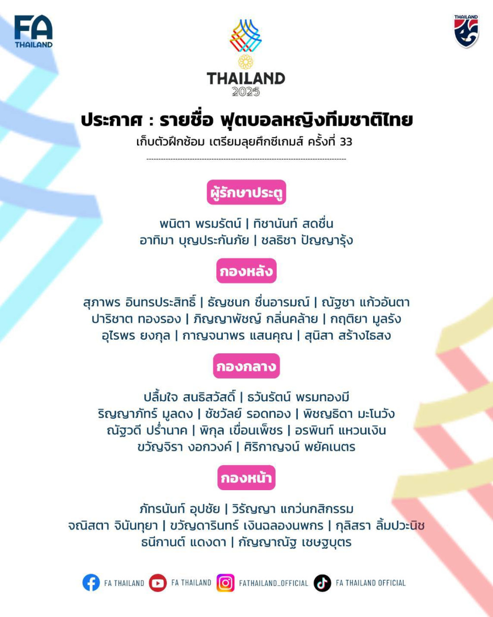 สมาคมกีฬาฟุตบอลแห่งประเทศไทย ในพระบรมราชูปถัมภ์ ประกาศรายชื่อ 30 นักฟุตบอลหญิงทีมชาติไทย เพื่อเก็บตัวฝึกซ้อม เตรียมความพร้อมก่อนทําการแข่งขันมหกรรมกีฬาซีเกมส์ ครั้งที่ 33 ที่ประเทศไทยเป็นเจ้าภาพ ระหว่างวันที่ 9-20 ธันวาคม 2568 ณ ชลบุรี สเตเดียม ภายใต้การคุมทัพของ “โค้ชหนึ่ง” หนึ่งฤทัย สระทองเวียน หัวหน้าผู้ฝึกสอน