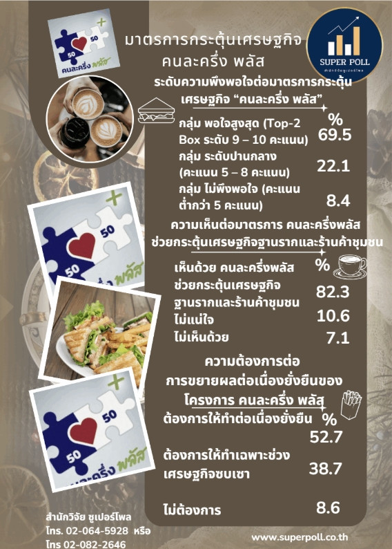 รายงานของซูเปอร์โพล ระบุกลุ่มตัวอย่างส่วนใหญ่ ร้อยละ 82.3 เห็นด้วยว่า มาตรการ “คนละครึ่ง พลัส”