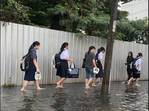 ขณะที่บริเวณหน้าโรงเรียนเตรียมอุดมศึกษาพัฒนาการ น้ําท่วมขังสูง เด็กนักเรียนต้องลุยน้ําไปเรียน // ด้านโรงเรียนเบญจมราชานุสรณ์ ถนนประชานิเวศน์ 3 ตําบลท่าทราย อ.เมืองนนทบุรี ประกาศจัดการเรียนการสอนในรูปแบบออนไลน์ เนื่อจากเมื่อคืนที่ผ่านมาเกิดฝนตกหนัก ส่งผลให้มีน้ําท่วมขังบริเวณด้านหน้าโรงเรียน ทําให้การเดินทางมาโรงเรียนของนักเรียนได้รับความลําบาก