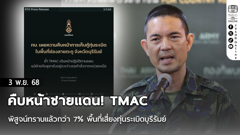 วันที่ 3 พ.ย.68 - พลตรี วินธัย สุวารี โฆษกกองทัพบก เผยว่า เมื่อวันที่ 1 พฤศจิกายน 2568 ศูนย์ปฏิบัติการกองทัพบกได้รับรายงานจาก กองกําลังสุรนารี เกี่ยวกับความคืบหน้าในการเก็บกู้ทุ่นระเบิดของศูนย์ปฏิบัติการทุ่นระเบิดแห่งชาติ (TMAC) ในพื้นที่ ช่องสายตะกู อําเภอบ้านกรวด จังหวัดบุรีรัมย์ ซึ่งได้เริ่มดําเนินการตามแผนตั้งแต่วันที่ 28 ตุลาคม 2568 ปัจจุบัน TMAC ได้เข้าพิสูจน์ทราบพื้นที่แล้ว ร้อยละ 7.62 ของพื้นที่ทั้งหมด 355,026 ตารางเมตร โดยระหว่างการปฏิบัติงานได้พบปัญหาและข้อขัดข้องบางประการ ดังนี้ฃ