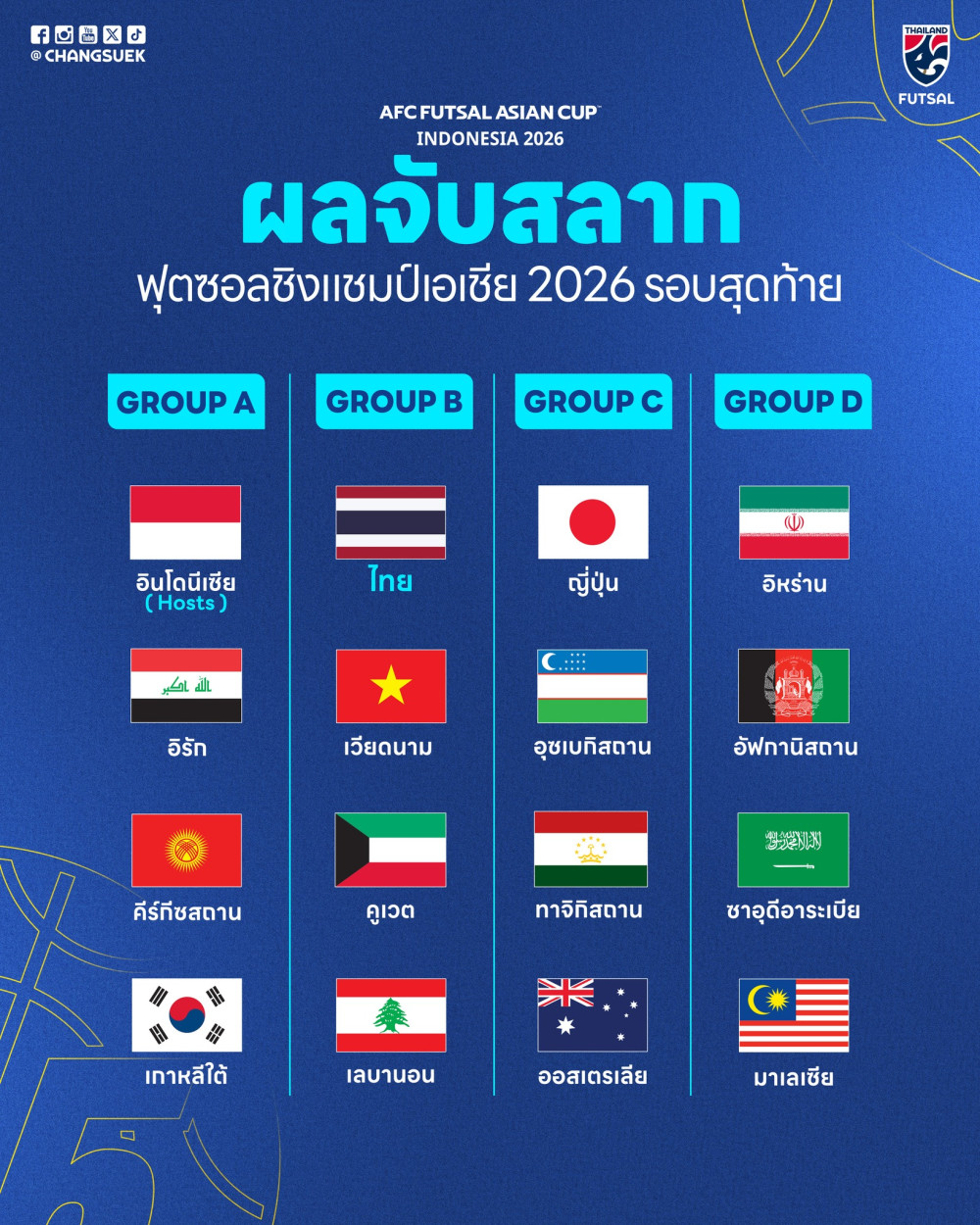 เปิดโผแบ่งสายศึกฟุตซอลชิงแชมป์เอเชีย 2026 ไทยร่วมกลุ่มบีชนเวียดนาม คูเวต และเลบานอน ชิงชัยที่อินโดนีเซียต้นปีหน้า