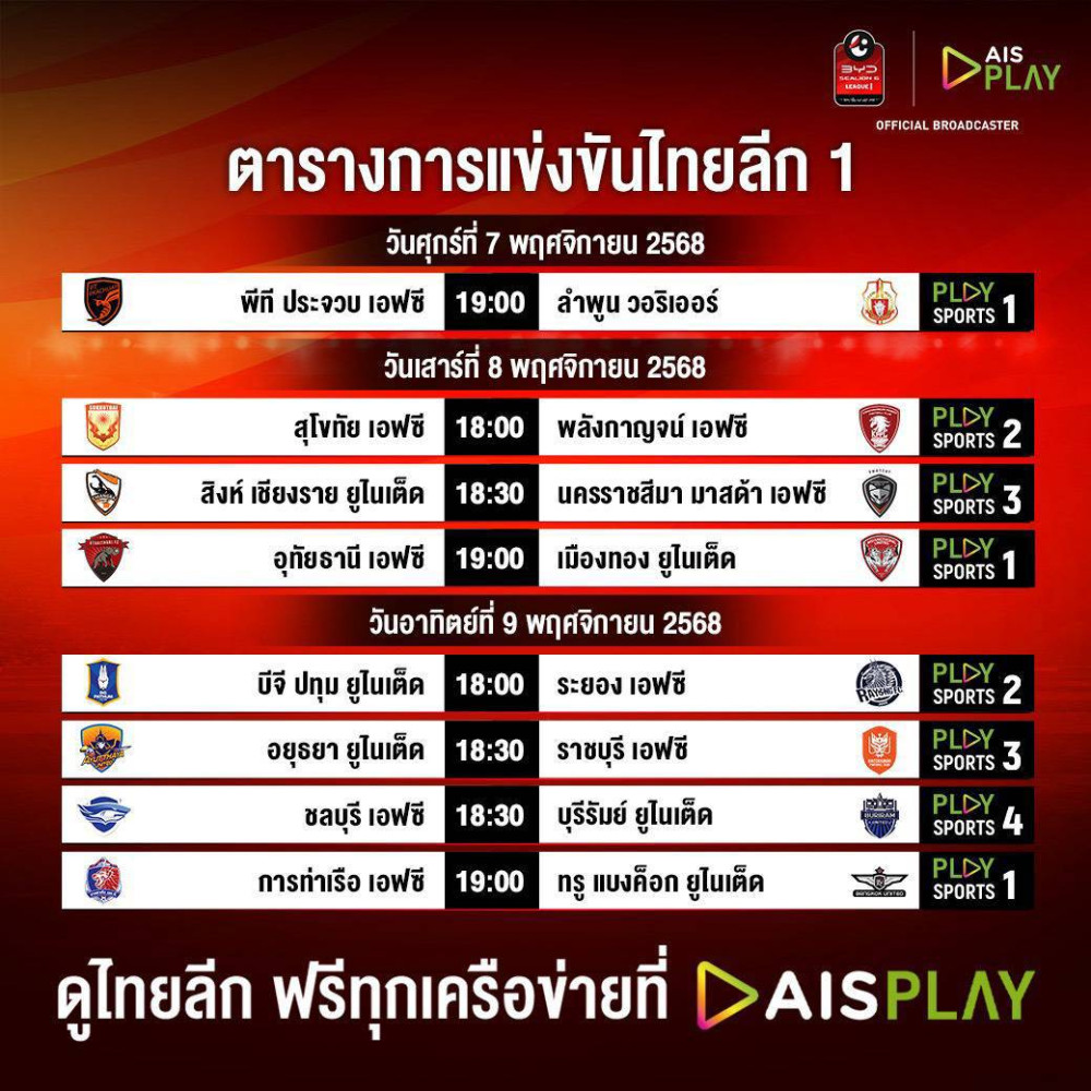 ฟุตบอลไทยลีก 1 "บีวายดี ซีไลออน 6 ลีกหนึ่ง" ลงสนามฟาดแข้งกันกันอย่างต่อเนื่อง โดย AIS PLAY ยังคงเอาใจคอบอลไทย ยิงสดจากขอบสนามให้ทุกคนได้ชมกันแบบฟรีๆ เหมือนเดิม