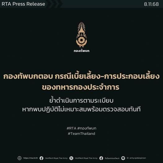 กองทัพบกตอบกระแสวิจารณ์ กรณีเบี้ยเลี้ยง-การประกอบเลี้ยงของทหารกองประจําการ ย้ําดําเนินการตามระเบียบ หากพบการปฏิบัติไม่เหมาะสมพร้อมตรวจสอบทันที