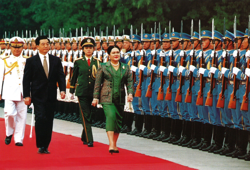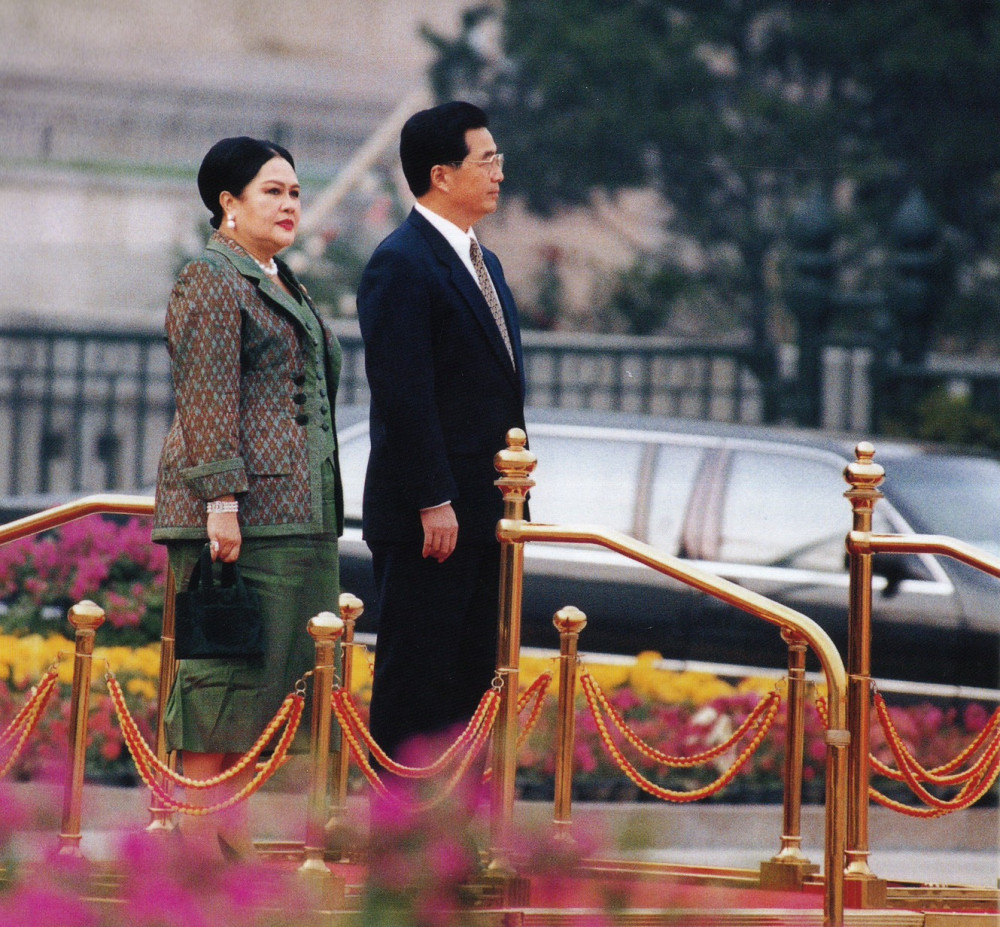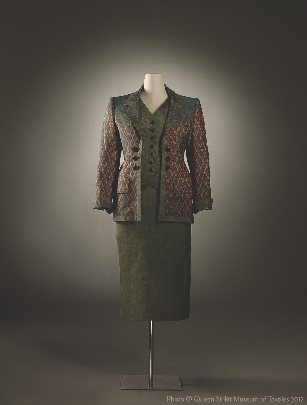 สมเด็จพระนางเจ้าสิริกิติ์ พระบรมราชินีนาถ พระบรมราชชนนีพันปีหลวง ทรงฉลองพระองค์ตัดเย็บจากผ้าไหมมัดหมี่ ผ้าไหมลายเกล็ดเต่า และผ้าไหมพื้น ออกแบบโดยห้องเสื้อ Givenchy ในพิธีรับเสด็จอย่างเป็นทางการ ณ มหาศาลาประชาชน กรุงปักกิ่ง เมื่อวันที่ 16 ตุลาคม พ.ศ. 2543 ในการเสด็จเยือนสาธารณรัฐประชาชนจีนอย่างเป็นทางการแทนพระองค์พระบาทสมเด็จพระบรมชนกาธิเบศร มหาภูมิพลอดุลยเดชมหาราช บรมนาถบพิตร ตามคํากราบบังคมทูลเชิญของนายเจียง เจ๋อหมิน ประธานาธิบดีแห่งสาธารณรัฐประชาชนจีน