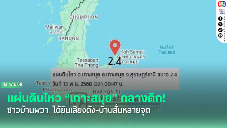 ชาวเกาะสมุยสะดุ้งกลางดึก หลัง กองเฝ้าระวังแผ่นดินไหว กรมอุตุนิยมวิทยา รายงานว่า เมื่อเวลา 00.47 น. วันที่ 13 พฤศจิกายน 2568 เกิดแผ่นดินไหวขนาด 2.4 แมกนิจูด บริเวณ ต.เกาะสมุย อ.เกาะสมุย จ.สุราษฎร์ธานี ลึกเพียง 4 กิโลเมตร จุดศูนย์กลางอยู่ที่ละติจูด 9.550°N ลองจิจูด 99.956°E