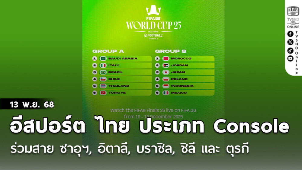 สหพันธ์ฟุตบอลนานาชาติหรือฟีฟ่า จัดพิธีจับสลากแบ่งสายการแข่งขัน FIFAe World Cup 2025 ft. eFootball ประเภท Console ที่จะจัดขึ้นที่ประเทศซาอุดีอาระเบีย ระหว่างวันที่ 10-13 ธันวาคม 2568 นี้