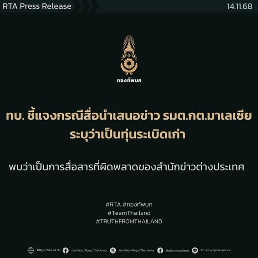 วันที่ 14 พ.ย.68 - พลตรี วินธัย สุวารี โฆษกกองทัพบก ได้ออกมาชี้แจงว่า จากการตรวจสอบข้อเท็จจริงพบว่า เป็นการนําเสนอข่าวที่ผิดพลาดของสํานักข่าว Bernama จนทําให้สื่อไทยและสื่อกัมพูชา นํามาเสนอข่าวจนเกิด ความผิดพลาด ซึ่งปัจจุบันได้มีการแก้ไขให้ถูกต้องแล้ว ทั้งนี้ เมื่อตรวจสอบจากเอกสารรายงานของ AOT ก็พบว่า มีการระบุว่าเป็น ทุ่นระเบิดที่วางใหม่ จึงเป็นเครื่องยืนยันว่าเหตุการณ์ผิดพลาดดังกล่าวเป็นเรื่องของการนําเสนอข่าวที่ผิดพลาดอย่างแน่นอน