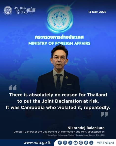 โฆษก กต. ยังชี้ว่า ฝ่ายกัมพูชาได้ละเมิด Joint Declaration – JD อย่างต่อเนื่อง ทั้งจากเหตุลอบวางทุ่นระเบิดสังหารบุคคลใหม่ในเขตแดนไทย จนทําให้ทหารไทยทุพพลภาพหนึ่งนาย และการยิงยั่วยุเมื่อวันที่ 12 พฤศจิกายนที่ผ่านมา ขณะเดียวกันยังพยายามเผยแพร่ข้อมูลบิดเบือน จัดฉากทําทีเป็นเหยื่อ เพื่อสร้างความชอบธรรมให้ตนเอง ซึ่ง ไม่ใช่ครั้งแรก และสะท้อนถึง ความไม่จริงใจในการรักษาสันติภาพร่วมกัน
