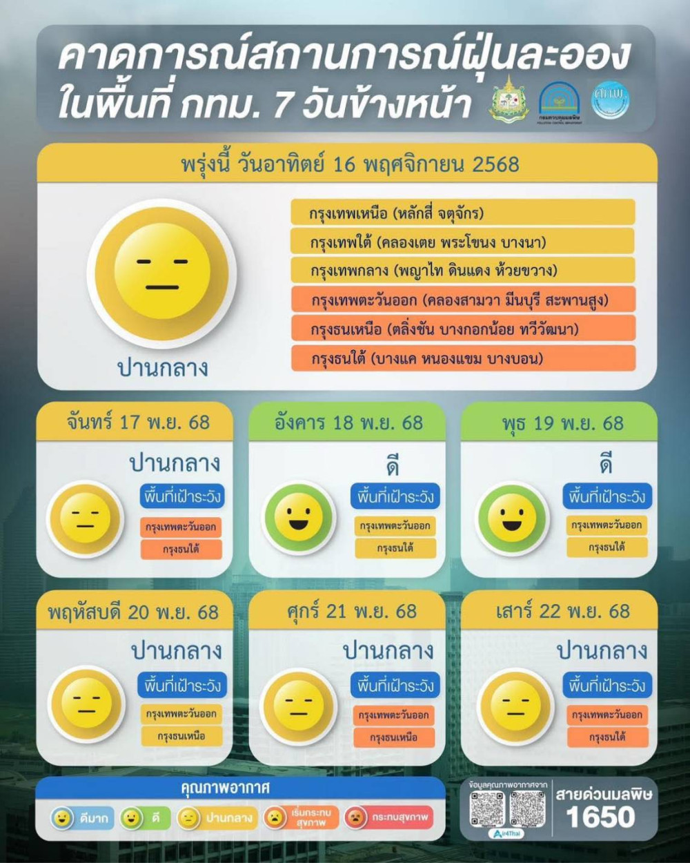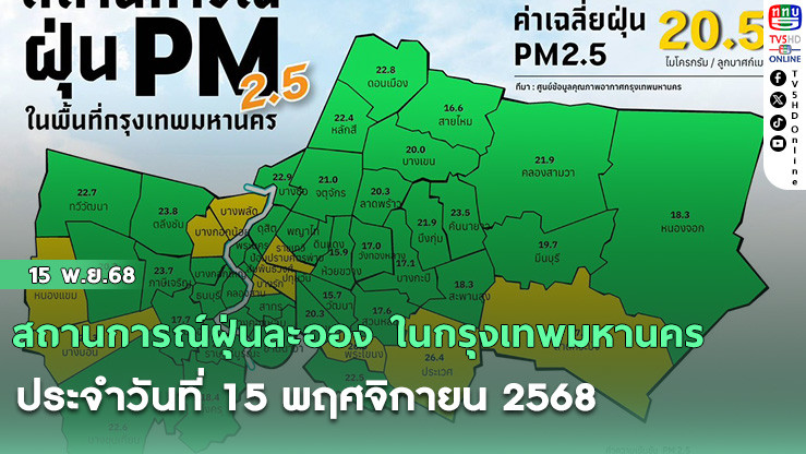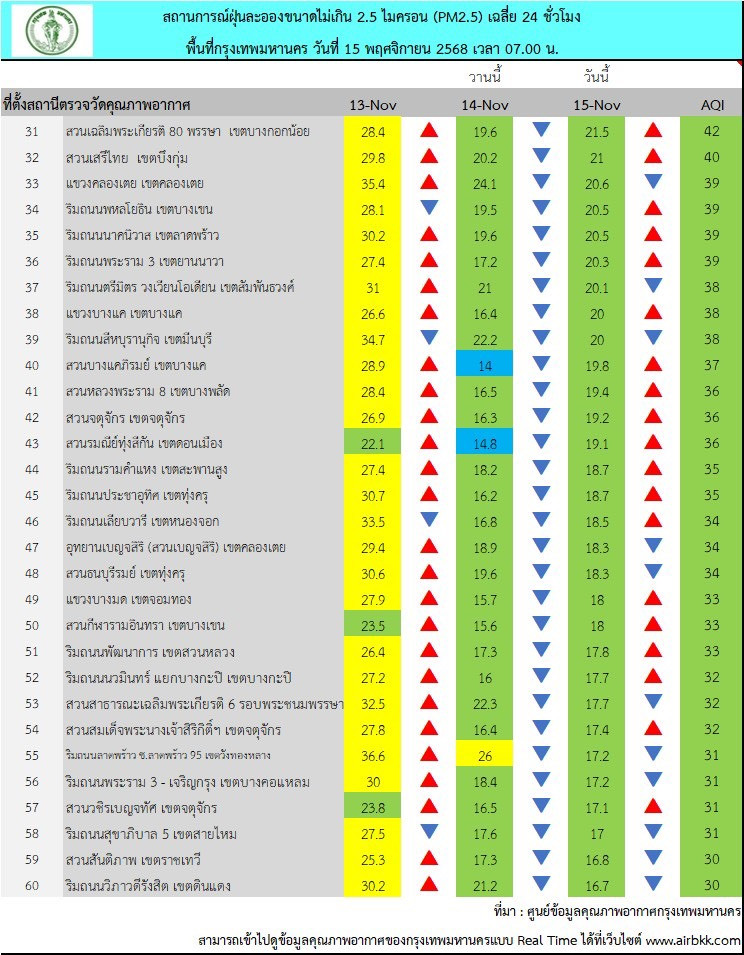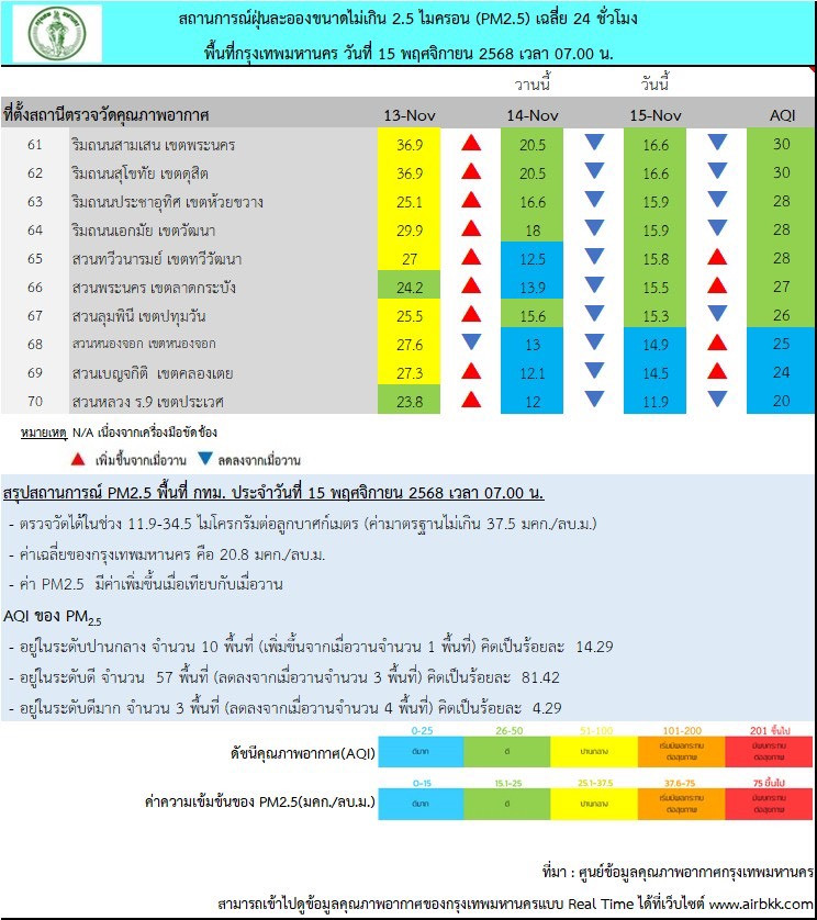 ศูนย์ข้อมูลคุณภาพอากาศกรุงเทพมหานคร ขอรายงานสถานการณ์ฝุ่นละอองขนาดไม่เกิน 2.5 ไมครอน (PM 2.5) ในกรุงเทพมหานคร ประจําวันที่ 15 พฤศจิกายน 2568 เวลา 07:00 น.