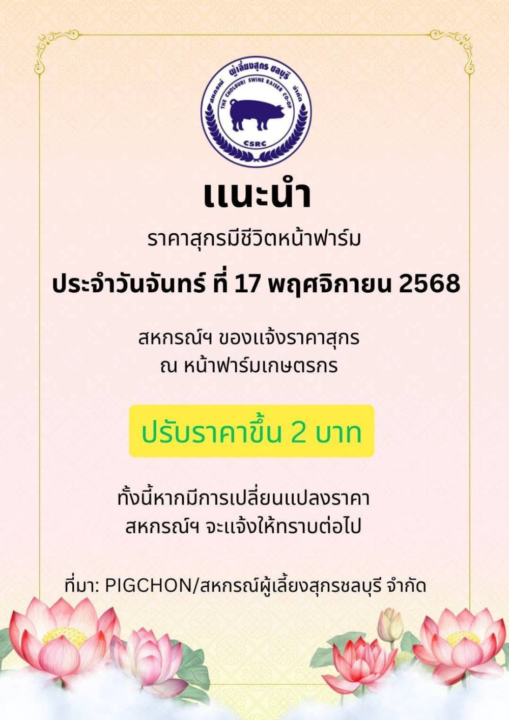 ในส่วนของ เนื้อหมู ทาง เครือข่ายผู้เลี้ยงสุกร ซึ่งครอบคลุมหลายภูมิภาค ได้แก่ ภาคตะวันออกเฉียงเหนือ, ภาคกลางตอนบน, ภาคใต้ และจังหวัดชลบุรี ได้ประกาศแจ้งสมาชิกและเกษตรกรว่า ราคาสุกรมีชีวิตหน้าฟาร์ม (สุกรขุน) จะปรับขึ้นอีก 2 บาทต่อกิโลกรัม จากฐานราคาเดิม โดยมีผลบังคับใช้พร้อมกันในวันนี้