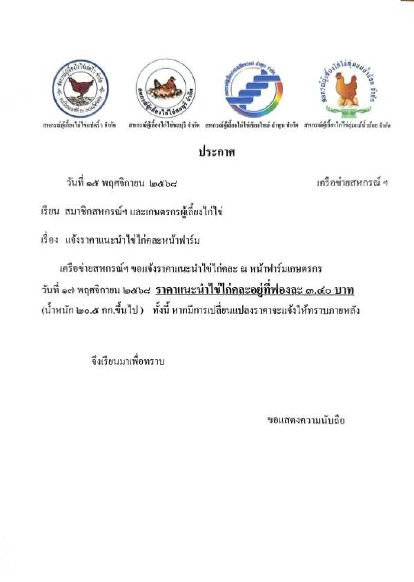 เครือข่ายสหกรณ์ผู้เลี้ยงไก่ไข่ ซึ่งประกอบด้วย สหกรณ์ผู้เลี้ยงไก่ไข่รายใหญ่ 4 แห่ง ได้แก่ แปดริ้ว, ชลบุรี, เชียงใหม่-ลําพูน, และลุ่มแม่น้ําน้อย ได้ประกาศปรับราคา ไข่ไก่คละหน้าฟาร์ม ขึ้นอีก 20 สตางค์ต่อฟอง หรือคิดเป็นการปรับขึ้น แผงละ 6 บาท ราคาเดิม 3.20 บาท/ฟอง โดยราคาใหม่อยู่ที่ 3.40 บาท/ฟอง