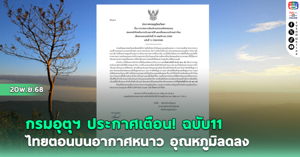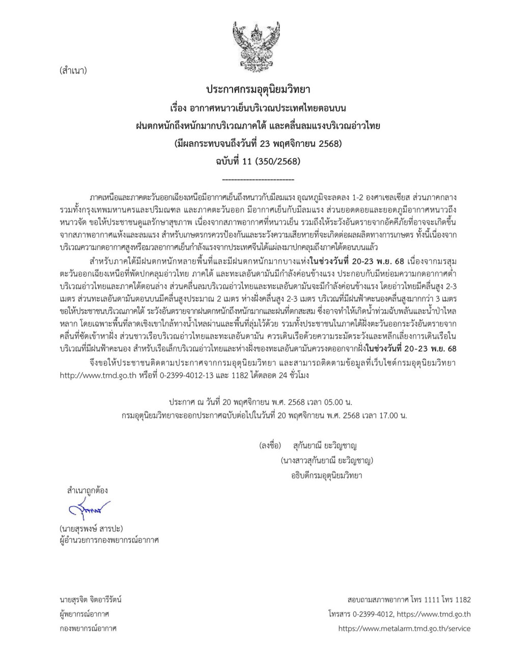 วันที่ 20 พ.ย. 2568 เว็บไซต์กรมอุตุนิยมวิทยา ประกาศเรื่อง "อากาศหนาวเย็นบริเวณประเทศไทยตอนบน ฝนตกหนักถึงหนักมากบริเวณภาคใต้ และคลื่นลมแรงบริเวณอ่าวไทย" มีผลกระทบจนถึงวันที่ 23 พฤศจิกายน 2568 ฉบับที่ 11 โดยระบุว่า ภาคเหนือและภาคตะวันออกเฉียงเหนือมีอากาศเย็นถึงหนาวกับมีลมแรง อุณหภูมิจะลดลง 1-2 องศาเซลเซียส ส่วนภาคกลาง รวมทั้งกรุงเทพมหานครและปริมณฑล และภาคตะวันออก มีอากาศเย็นกับมีลมแรง ส่วนยอดดอยและยอดภูมีอากาศหนาวถึงหนาวจัด