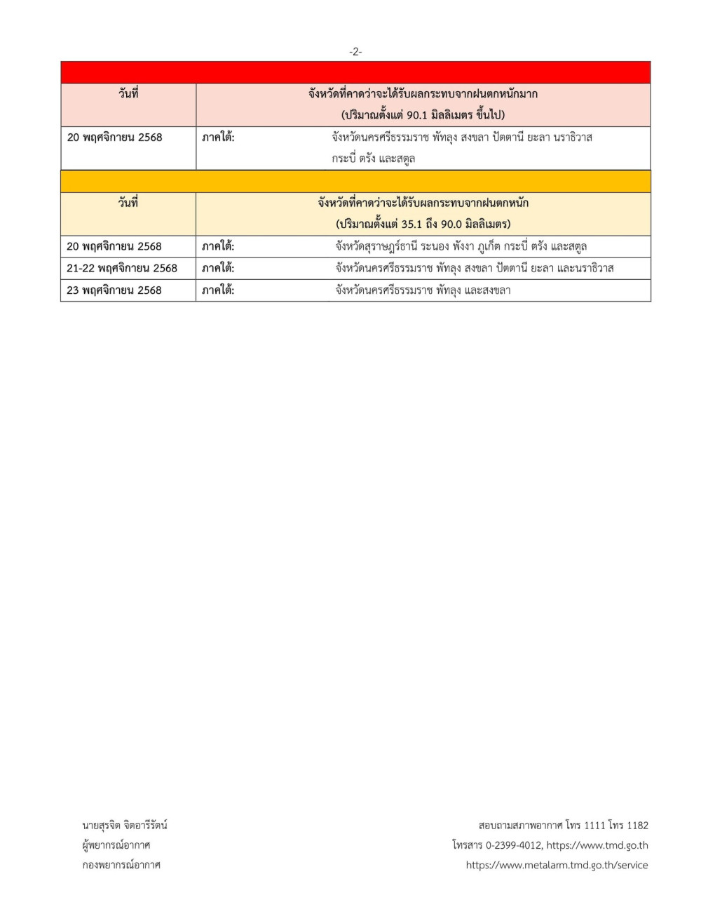 สําหรับภาคใต้มีฝนตกหนักหลายพื้นที่และมีฝนตกหนักมากบางแห่งในช่วงวันที่ 20-23 พ.ย. 2568 เนื่องจากมรสุมตะวันออกเฉียงเหนือที่พัดปกคลุมอ่าวไทย ภาคใต้ และทะเลอันดามันมีกําลังค่อนข้างแรง ประกอบกับมีหย่อมความกดอากาศต่ําบริเวณอ่าวไทยและภาคใต้ตอนล่าง ส่วนคลื่นลมบริเวณอ่าวไทยและทะเลอันดามันจะมีกําลังค่อนข้างแรง โดยอ่าวไทยมีคลื่นสูง 2-3 เมตร