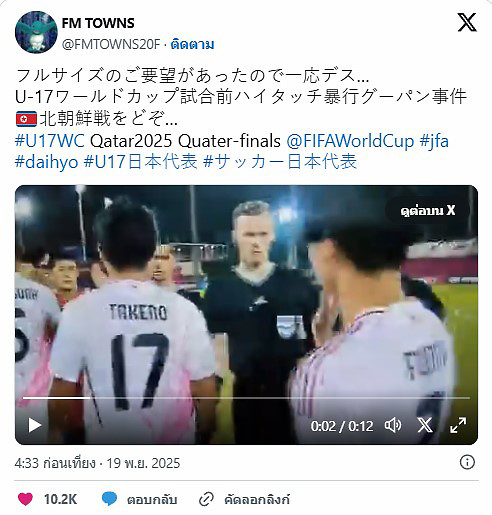 นักเตะเกาหลีเหนือก่อดราม่าก่อนเกม! ทําท่าคล้ายต่อยใส่นักเตะญี่ปุ่นระหว่างพิธีทักทาย ฟุตบอลโลก U-17 ที่กาตาร์
