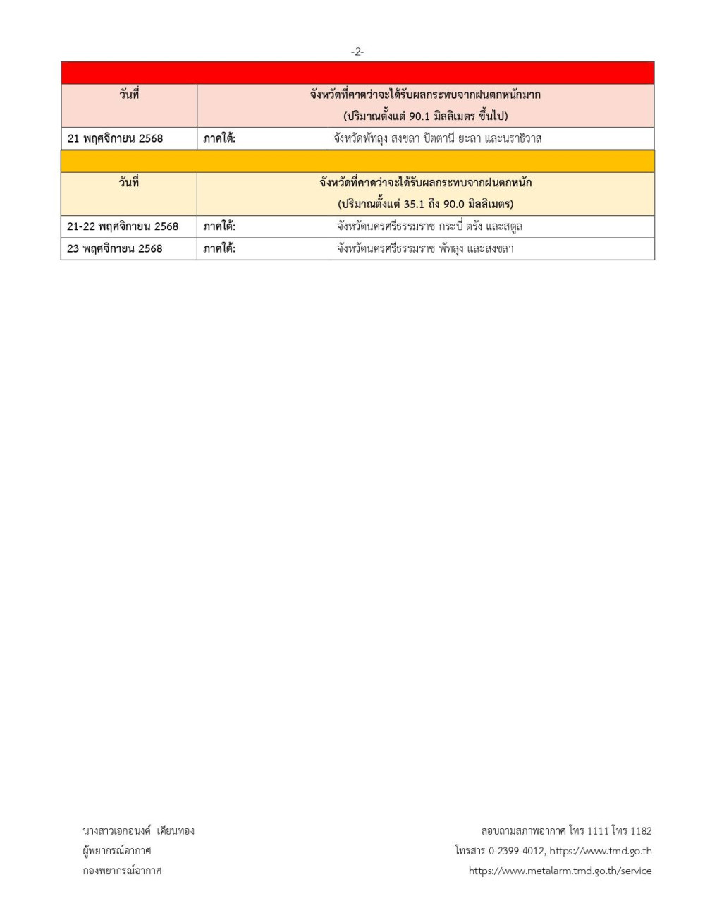 สําหรับภาคใต้มีฝนตกหนักหลายพื้นที่และมีฝนตกหนักมากบางแห่งในช่วงวันที่ 21-23 พ.ย. 2568 เนื่องจากมรสุมตะวันออกเฉียงเหนือที่พัดปกคลุมอ่าวไทย ภาคใต้ และทะเลอันดามันมีกําลังค่อนข้างแรง ประกอบกับมีหย่อมความกดอากาศต่ําบริเวณอ่าวไทยและภาคใต้ตอนล่าง ส่วนคลื่นลมบริเวณอ่าวไทยและทะเลอันดามันจะมีกําลังค่อนข้างแรง โดยอ่าวไทยมีคลื่นสูง 2-3 เมตร ส่วนทะเลอันดามันตอนบนมีคลื่นสูงประมาณ 2 เมตร ห่างฝั่งคลื่นสูง 2-3 เมตร บริเวณที่มีฝนฟ้าคะนองคลื่นสูงมากกว่า 3 เมตร ขอให้ประชาชนบริเวณภาคใต้ ระวังอันตรายจากฝนตกหนักถึงหนักมากและฝนที่ตกสะสม ซึ่งอาจทําให้เกิดน้ําท่วมฉับพลันและน้ําป่าไหลหลาก โดยเฉพาะพื้นที่ลาดเชิงเขาใกล้ทางน้ําไหลผ่านและพื้นที่ลุ่มไว้ด้วย รวมทั้งประชาชนในภาคใต้ฝั่งตะวันออกระวังอันตรายจากคลื่นที่ซัดเข้าหาฝั่ง