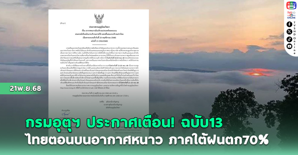 กรมอุตุนิยมวิทยา ประกาศเตือน เรื่อง อากาศหนาวเย็นบริเวณประเทศไทยตอนบน ฝนตกหนักถึงหนักมากบริเวณภาคใต้ และคลื่นลมแรงบริเวณอ่าวไทย (มีผลกระทบจนถึงวันที่ 23 พ.ย. 2568) ฉบับที่ 13 ภาคเหนือและภาคตะวันออกเฉียงเหนือมีอากาศเย็นถึงหนาวกับมีลมแรง ส่วนภาคกลาง รวมทั้งกรุงเทพมหานครและปริมณฑล และภาคตะวันออก มีอากาศเย็นกับมีลมแรง สําหรับยอดดอยและยอดภูมีอากาศหนาวถึงหนาวจัด ขอให้ประชาชนดูแลรักษาสุขภาพ เนื่องจากสภาพอากาศที่หนาวเย็น รวมถึงให้ระวังอันตรายจากอัคคีภัยที่อาจจะเกิดขึ้นจากสภาพอากาศแห้งและลมแรง สําหรับเกษตรกรควรป้องกันและระวังความเสียหายที่จะเกิดต่อผลผลิตทางการเกษตร