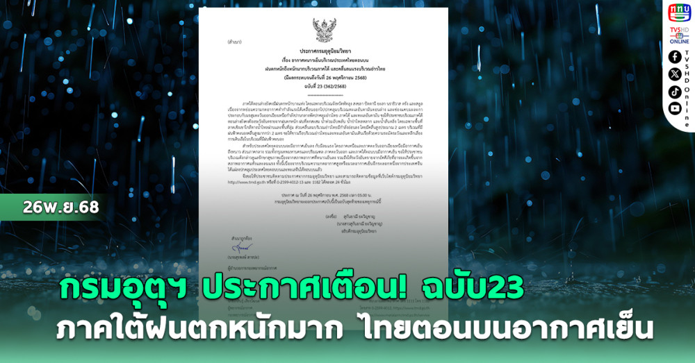 ประกาศกรมอุตุนิยมวิทยา เรื่อง อากาศหนาวเย็นบริเวณประเทศไทยตอนบน ฝนตกหนักถึงหนักมากบริเวณภาคใต้ และคลื่นลมแรงบริเวณอ่าวไทย(มีผลกระทบจนถึงวันที่ 26 พฤศจิกายน 2568)ฉบับที่ 23 (362/2568)