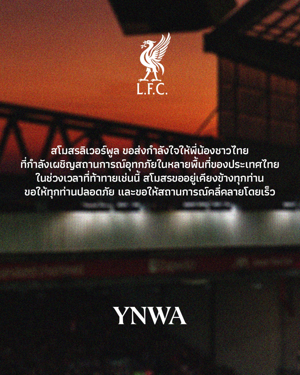 “สโมสรลิเวอร์พูล ขอส่งกําลังใจให้พี่น้องชาวไทยที่กําลังเผชิญสถานการณ์อุทกภัยในหลายพื้นที่ของประเทศไทย ในช่วงเวลาที่ท้าทายเช่นนี้ สโมสรขออยู่เคียงข้างทุกท่าน ขอให้ทุกท่านปลอดภัย และขอให้สถานการณ์คลี่คลายโดยเร็ว YNWA”