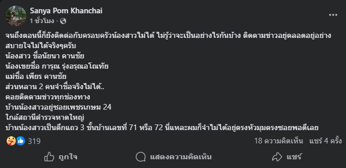 เขากล่าวว่า “จนถึงตอนนี้ก็ยังติดต่อกับครอบครัวน้องสาวไม่ได้ ไม่รู้ว่าจะเป็นอย่างไรกันบ้าง ติดตามข่าวอยู่ตลอด อยู่อย่างสบายใจไม่ได้จริงๆครับ” พร้อมให้รายละเอียดเพิ่มเติมว่า