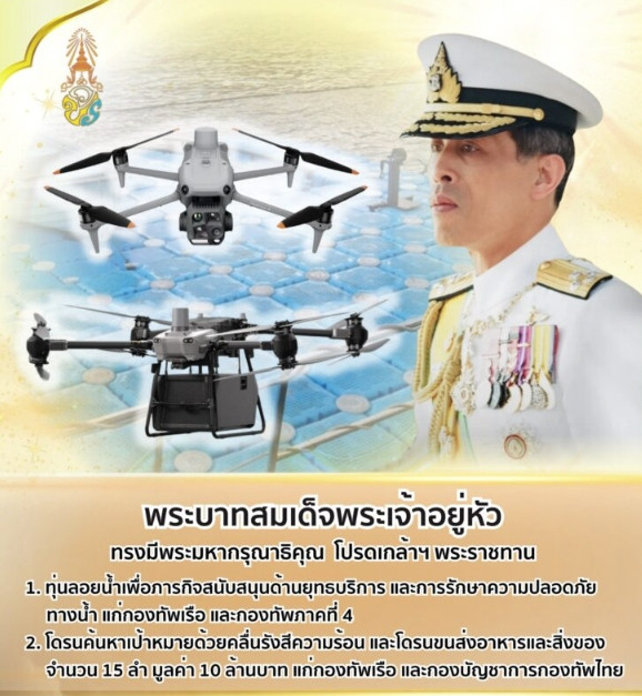 พระบาทสมเด็จพระเจ้าอยู่หัว ทรงพระกรุณาโปรดเกล้าฯ พระราชทานทุ่นลอยน้ําและโดรนค้นหา–กู้ภัย เพื่อสนับสนุนการปฏิบัติภารกิจด้านช่วยเหลือประชาชน