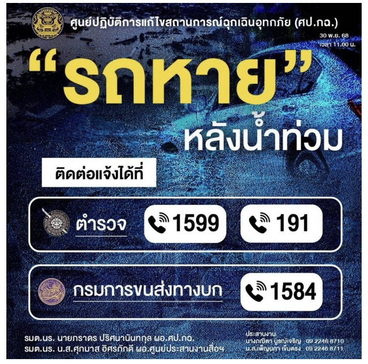 เรื่องต่อมาคือรถหายหลังน้ําท่วม สามารถติดต่อ สอบถามได้สองช่องทาง คือทางตํารวจหมายเลข 1599 หรือ 191 และกรมการขนส่งทางบกหมายเลข 1584 โดยรถที่อยู่ในหาดใหญ่ซึ่งจอดอยู่ในพื้นที่สาธารณะ ทางเจ้าหน้าที่จะทําการย้ายไปจอดรวมกันที่สนามกีฬาหาดใหญ่ และสวนสาธารณะหาดใหญ่ ขณะเดียวกันทางกรมการขนส่งทางบกก็จะติดต่อประสานไปทางเจ้าของรถที่ไม่สามารถมาเคลื่อนย้ายรถไปได้ว่าจะให้ทางภาครัฐดําเนินการต่อไปอย่างไร