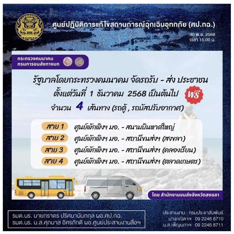 “ศป.กฉ.” เผย วันนี้ผู้ประสบภัยได้เงินเยียวยา 9,000 บาท ชุดแรก แล้วจะเร่งดําเนินการให้ครบให้เร็วที่สุด คาดรพ.หาดใหญ่เปิดให้บริการเต็มที่ใน5-8 สัปดาห์ กรณีรถหาย-รถเสียติดต่อได้ทางตํารวจหรือกรมการขนส่งทางบก