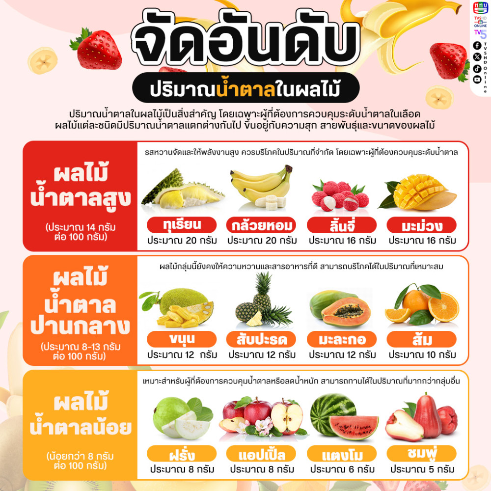 สําหรับใครที่กําลัง ควบคุมระดับน้ําตาลในเลือด ไม่ว่าจะเป็นผู้ป่วยเบาหวาน หรือกําลังลดน้ําหนัก การรู้ปริมาณน้ําตาลในผลไม้เป็นสิ่งสําคัญมากเลยนะ! วันนี้มาดูกันว่าผลไม้ที่คุณชอบอยู่ในกลุ่มไหนบ้าง (ปริมาณน้ําตาลโดยเฉลี่ยต่อ 100 กรัมของผลไม้ที่กินได้)