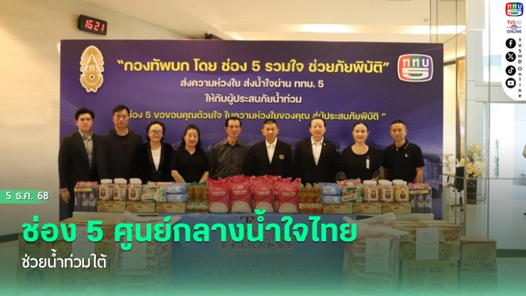 สถานีวิทยุโทรทัศน์กองทัพบก (ททบ.5) ยังคงเดินหน้าภารกิจเป็นศูนย์กลางรับบริจาคภายใต้โครงการ "กองทัพบกโดย ช่อง5 ส่งต่อธารน้ําใจ คนไทยไม่ทิ้งกัน" เพื่อเร่งช่วยเหลือผู้ประสบอุทกภัยในพื้นที่ภาคใต้
